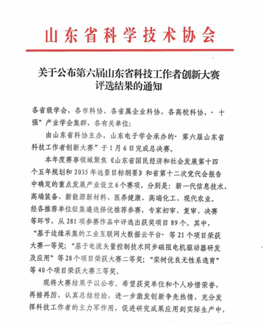 由山東省科協(xié)主辦,山東電子學(xué)會(huì)承辦的"第六屆山東省科技工作者創(chuàng)新大賽”1月6日完成總決賽。本年度賽事領(lǐng)域聚焦《山東省國民經(jīng)濟(jì)和社會(huì)發(fā)展第十四個(gè)五年規(guī)劃和2035年遠(yuǎn)景目標(biāo)綱要》和省第十二次黨代會(huì)報(bào)告中確定的重點(diǎn)發(fā)展產(chǎn)業(yè)設(shè)立6個(gè)賽項(xiàng),分別是:新一代信息技術(shù)、高端裝備、新能源新材料、醫(yī)養(yǎng)健康、高端化工、現(xiàn)代農(nóng)業(yè)。經(jīng)各推薦單位征集遴選擇優(yōu)推薦參賽,專家初審、復(fù)審、決賽等環(huán)節(jié),從281項(xiàng)參賽作品中評選出獲獎(jiǎng)項(xiàng)目89個(gè)。其中,山東健源生物科技有限公司《飼草料高效優(yōu)質(zhì)青貯關(guān)鍵技術(shù)研發(fā)與產(chǎn)業(yè)化》項(xiàng)目榮獲第六屆科技工作者創(chuàng)新大賽二等獎(jiǎng)。