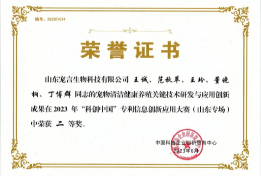 山東寵言生物科技有限公司《寵物清潔健康養(yǎng)殖關(guān)鍵技術(shù)研發(fā)與應(yīng)用》項目榮獲2023年科創(chuàng)中國專利信息創(chuàng)新應(yīng)用大賽(山東專場)二等獎