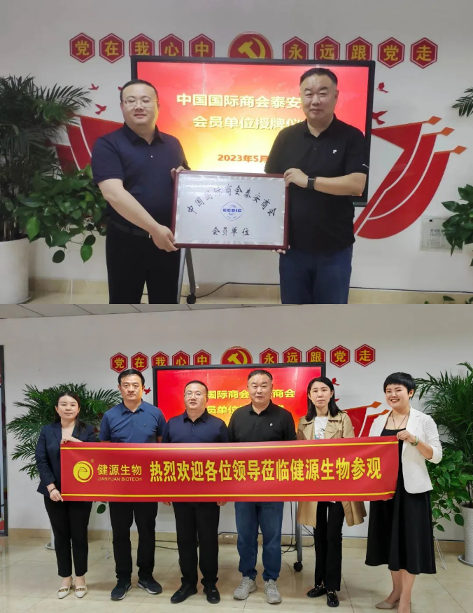 發(fā)布時間:[2023-6-28 9:19:4] 瀏覽量:3995次近日,泰安市國際商會秘書長趙傳兵一行四人專程來到山東健源生物科技有限公司參觀指導,并授予山東健源生物科技有限公司為“中國國際商會泰安商會會員單位”。