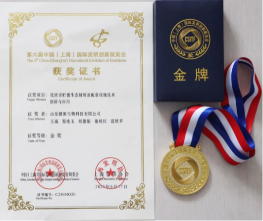 2023年6月17日,第六屆中國(guó)(上海)國(guó)際發(fā)明創(chuàng)新展覽會(huì)圓滿閉幕,頒獎(jiǎng)典禮在上海世博館隆重舉行,山東健源生物科技有限公司《優(yōu)質(zhì)青貯微生態(tài)制劑及配套設(shè)施技術(shù)創(chuàng)新與應(yīng)用》項(xiàng)目榮獲第六屆中國(guó)(上海)國(guó)際發(fā)明創(chuàng)新展覽會(huì)金獎(jiǎng)。