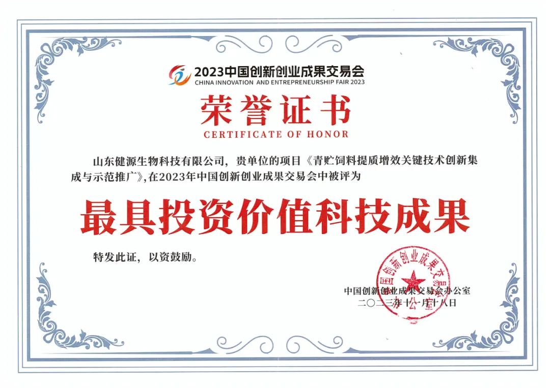 山東健源生物科技有限公司的《青貯飼料提質(zhì)增效關(guān)鍵技術(shù)創(chuàng)新集成與示范推廣》項(xiàng)目在2023年中國創(chuàng)新創(chuàng)業(yè)成果交易會(huì)中被評為最具投資價(jià)值科技成果,該獎(jiǎng)項(xiàng)的獲得充分肯定了健源生物在技術(shù)創(chuàng)新方面的卓越表現(xiàn)以及公司科技成果在市場應(yīng)用方面的優(yōu)秀潛力。