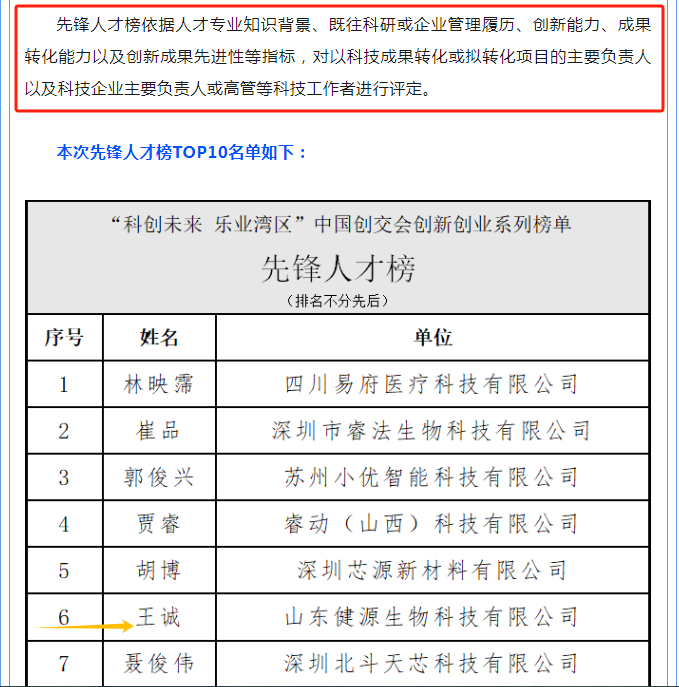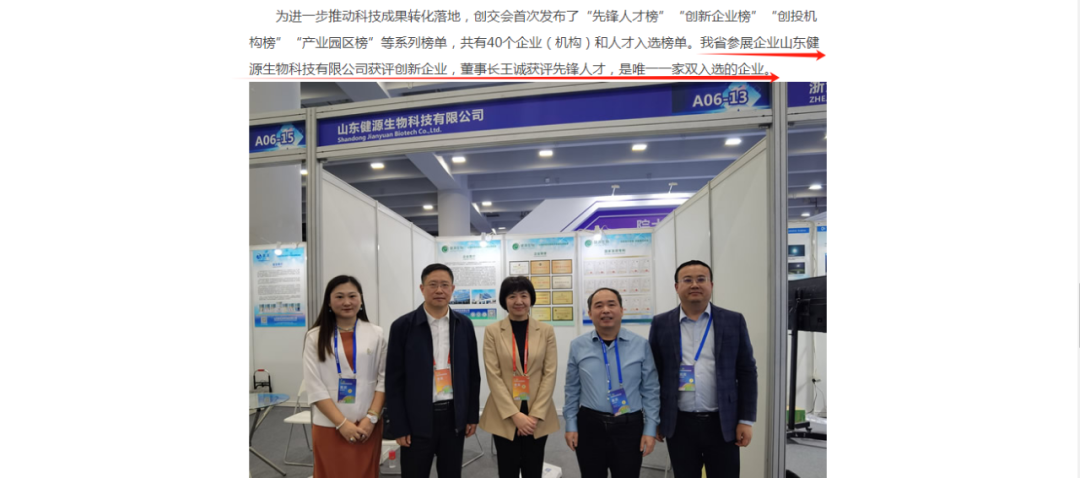 2023中國創(chuàng)新創(chuàng)業(yè)成果交易會(huì)于11月17日至19日在廣州舉辦。山東健源生物科技有限公司入選創(chuàng)新企業(yè)榜TOP10,董事長王誠入選先鋒人才榜TOP10,是山東省參展企業(yè)中唯一一家雙入選企業(yè)。