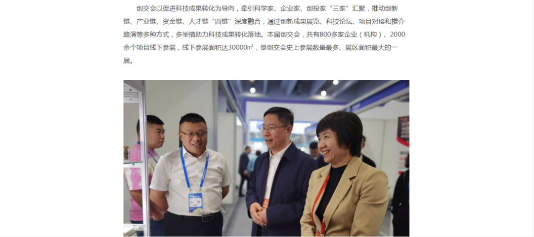 創(chuàng)交會(huì)在高端人才成果展區(qū)設(shè)立九三學(xué)社專區(qū),130家社員企業(yè)參展。九三學(xué)社中央社會(huì)服務(wù)部副部長蔣承華,山東省政協(xié)副秘書長、九三學(xué)社山東省委會(huì)專職副主委李宗濤,九三學(xué)社泰安市委會(huì)秘書長郭啟明相繼來到公司展位,聽取項(xiàng)目介紹,詳細(xì)了解成果轉(zhuǎn)化和市場前景等情況,鼓勵(lì)企業(yè)要充分發(fā)揮科技創(chuàng)新優(yōu)勢,積極服務(wù)地方經(jīng)濟(jì)社會(huì)發(fā)展。