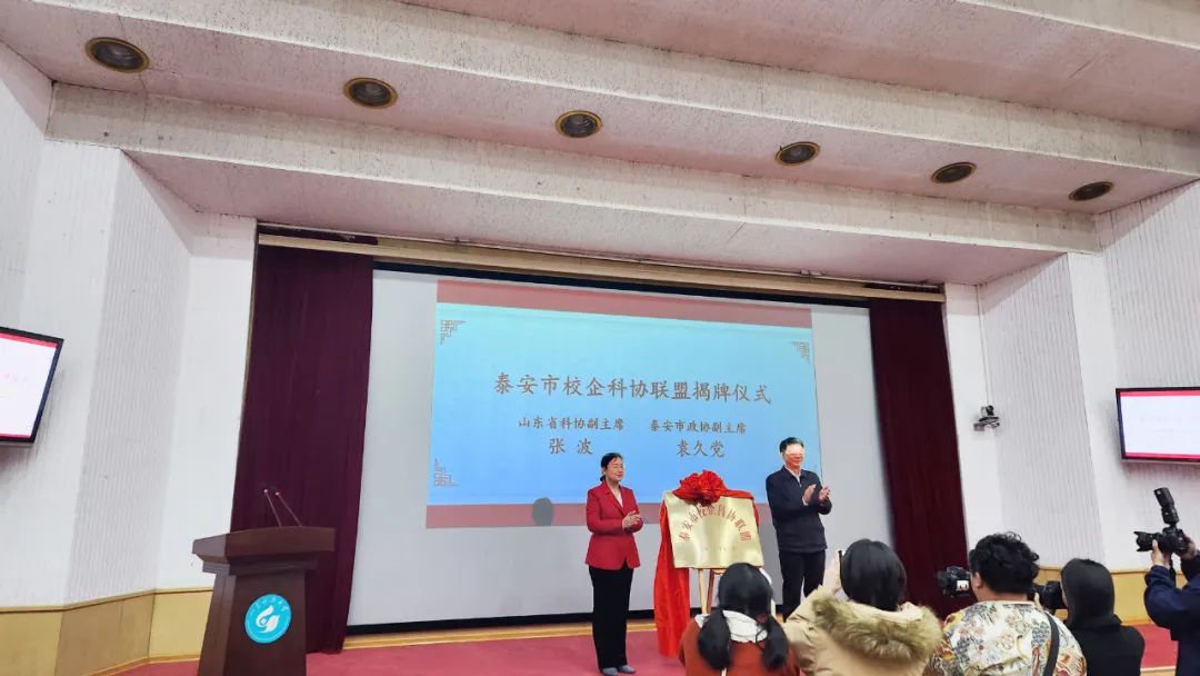 山東省科協(xié)副主席張波和泰安市政協(xié)副主席袁久黨為“泰安市校企科協(xié)聯(lián)盟”揭牌