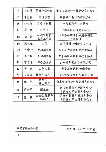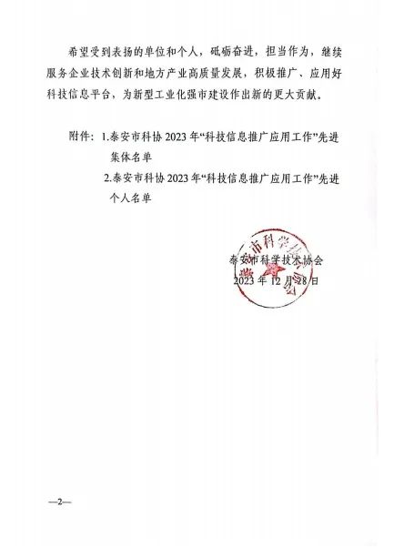 2023年12月28日,泰安市科學(xué)技術(shù)協(xié)會(huì)印發(fā)《關(guān)于表?yè)P(yáng)2023年“科技信息推廣應(yīng)用工作”先進(jìn)集體和先進(jìn)個(gè)人的通報(bào)》,山東健源生物科技有限公司董事長(zhǎng)王誠(chéng)被評(píng)為泰安市科協(xié)2023年“科技信息推廣應(yīng)用工作”先進(jìn)個(gè)人,山東健源生物科技有限公司被評(píng)為泰安市科協(xié)2023年“科技信息推廣應(yīng)用工作”先進(jìn)集體,旗下子公司寵言生物技術(shù)中心主任范秋萍被評(píng)為泰安市科協(xié)2023年“科技信息推廣應(yīng)用工作”先進(jìn)個(gè)人。