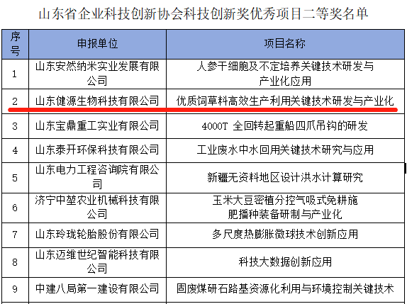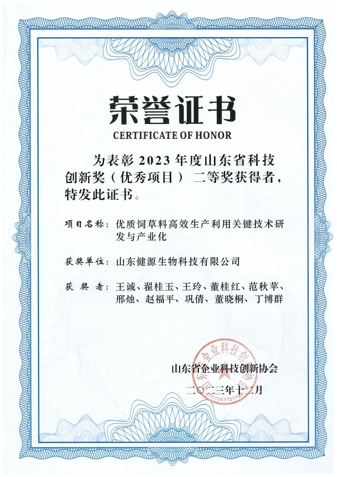 近日,山東省企業(yè)科技創(chuàng)新協(xié)會公布了《關于公示2023年度科技創(chuàng)新獎評審結(jié)果的決定》,山東健源生物科技有限公司董事長王誠被評為2023年度山東省科技創(chuàng)新獎先進個人,《優(yōu)質(zhì)飼草料高效生產(chǎn)利用關鍵技術研究與產(chǎn)業(yè)化》項目榮獲山東省科技創(chuàng)新獎優(yōu)秀項目二等獎。