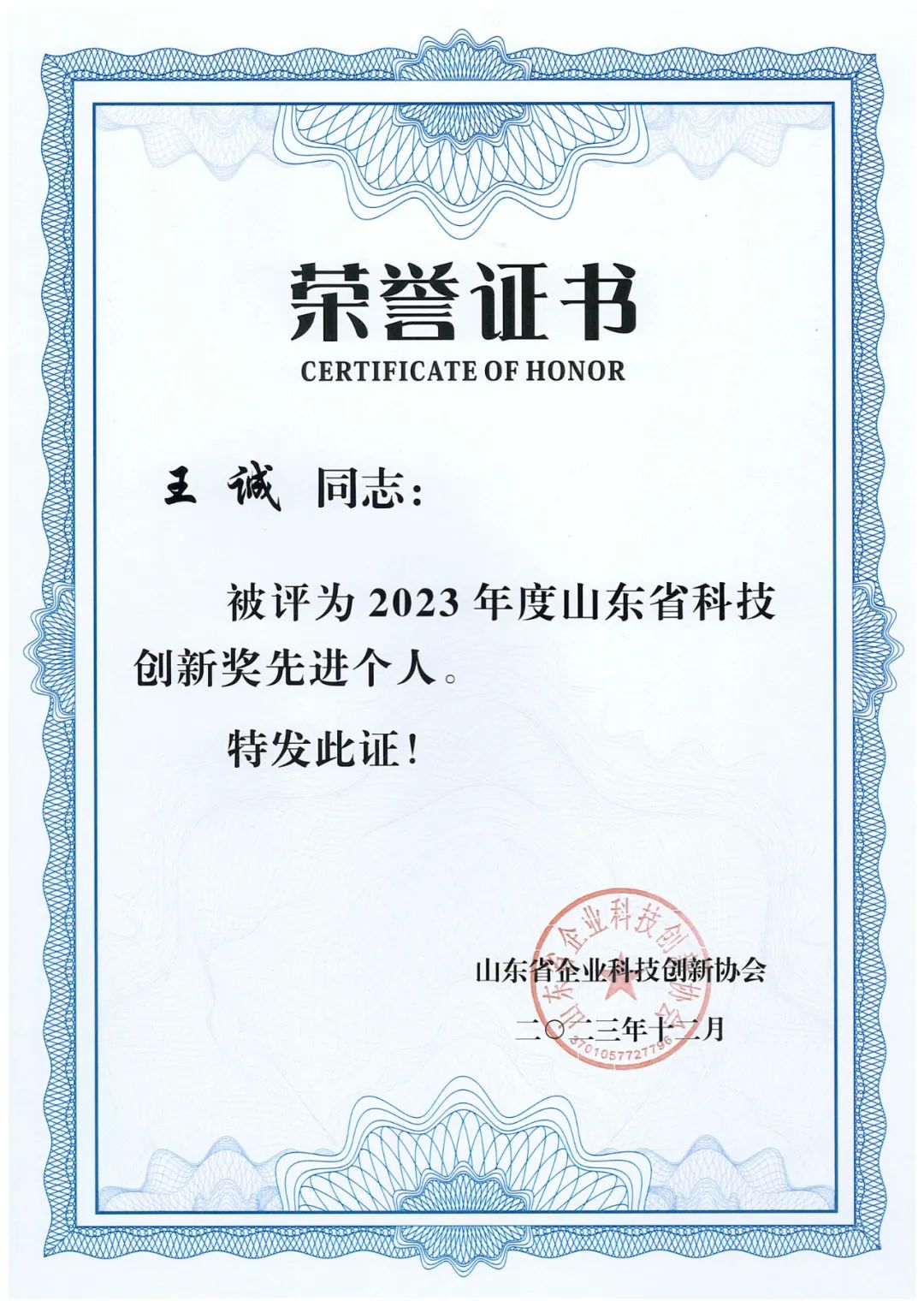 董事長王誠被評為山東省科技創(chuàng)新獎先進個人