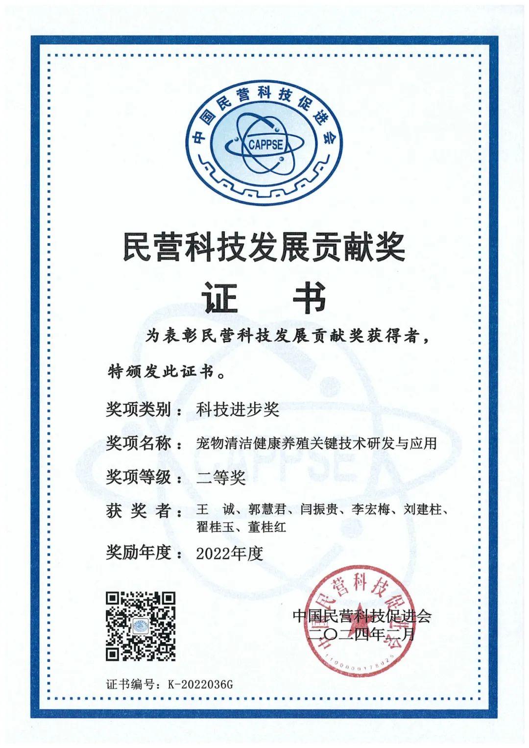 山東健源生物科技有限公司及旗下山東寵言生物科技有限公司聯(lián)合山東農(nóng)業(yè)大學(xué)共同完成的“寵物清潔健康養(yǎng)殖關(guān)鍵技術(shù)研發(fā)與應(yīng)用”項(xiàng)目榮獲“2022年度民營科技發(fā)展貢獻(xiàn)獎科技進(jìn)步獎二等獎”。
