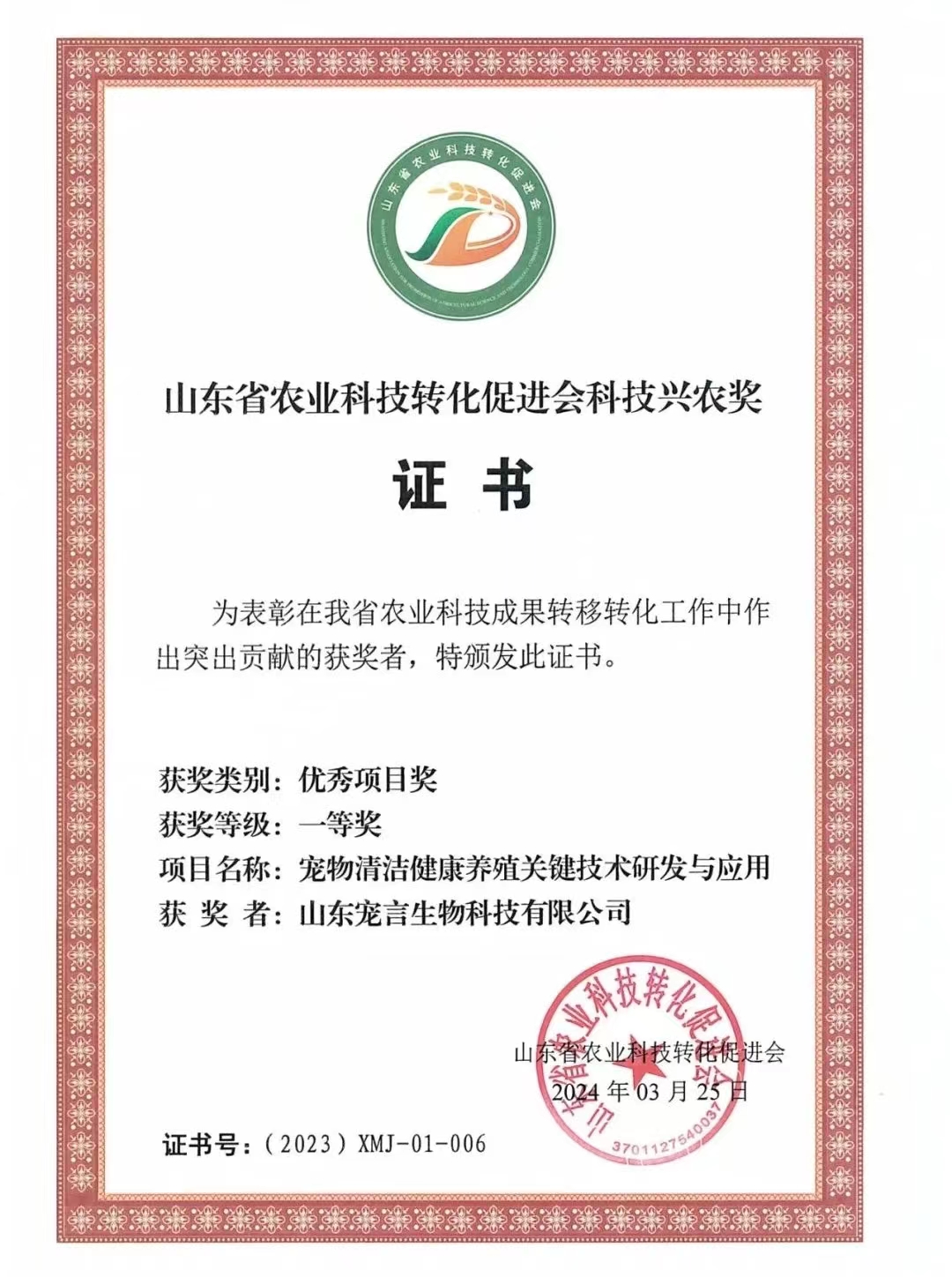 山東健源生物科技有限公司申報的《一種微生物秸稈發(fā)酵劑及其發(fā)酵秸稈的方法》項目獲得山東省農業(yè)科技轉化促進會科技興農獎優(yōu)秀項目獎專利獎。健源生物旗下子公司山東寵言生物科技有限公司申報的《寵物清潔健康養(yǎng)殖關鍵技術研發(fā)與應用》項目獲得山東省農業(yè)科技促進會科技興農獎優(yōu)秀項目獎一等獎,董事長王誠為兩個項目的第一完成人。