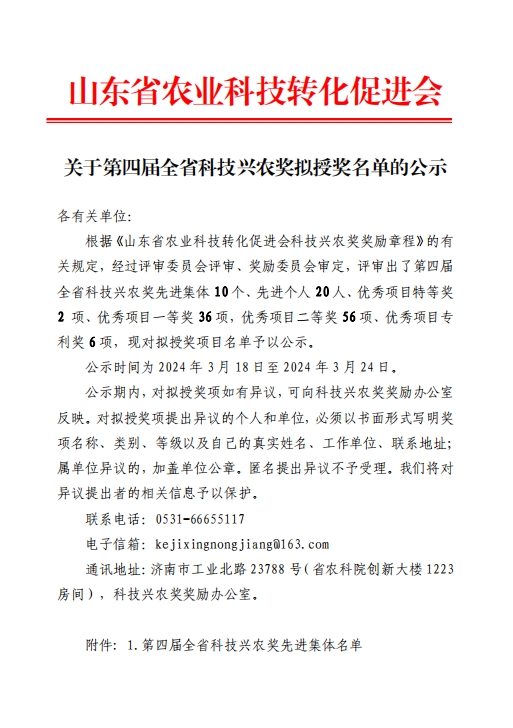 “科技興農獎”由山東省農業(yè)科技轉化促進會于2020年設立,旨在表彰和鼓勵為農業(yè)科技成果轉移轉化作出突出貢獻的個人和集體,加快促進農業(yè)科技成果轉化為現(xiàn)實生產力,助力打造科技支撐型鄉(xiāng)村振興齊魯樣板。