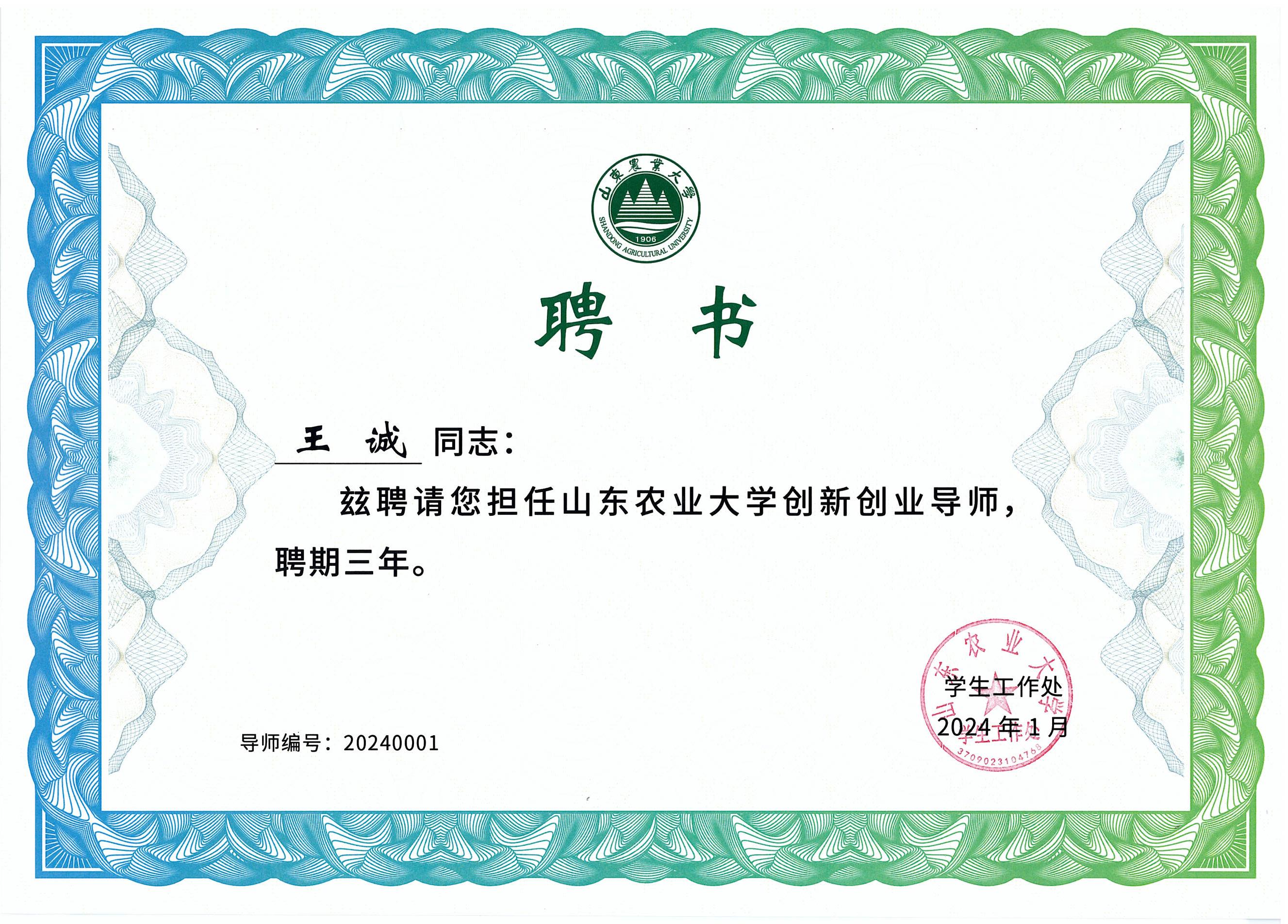 在創(chuàng)新創(chuàng)業(yè)之路上,王誠董事長一步一腳印,以實際行動踐行科技工作者精神,取得了一系列科研技術(shù)和成果突破,被聘請為“中國科協(xié)科技人才獎項評審專家”。2023年榮獲泰安市青年科技創(chuàng)新獎,作為項目第一完成人榮獲泰安市科學技術(shù)獎科技進步一等獎,2024年4月榮獲“齊魯最美工程師”稱號。被山東農(nóng)業(yè)大學聘請為“創(chuàng)新創(chuàng)業(yè)導師”和“研究生校外行業(yè)導師”。