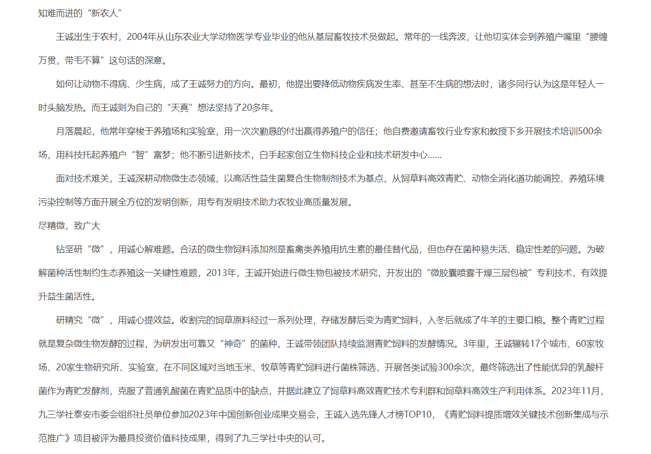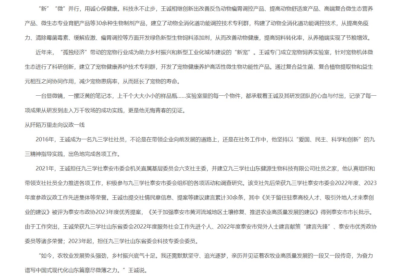 發(fā)布時(shí)間:[2024-8-7 15:16:1] 瀏覽量:3309次近日,中國(guó)人民政治協(xié)商會(huì)議山東省委員會(huì)官網(wǎng)推送《“微”而不凡的 科技“新農(nóng)人”》文章,報(bào)道山東健源生物科技有限公司董事長(zhǎng)王誠(chéng)作為“新農(nóng)人”,20多年來(lái)深耕微生態(tài)領(lǐng)域,以高活動(dòng)性益生菌復(fù)合生物制劑技術(shù)為基點(diǎn),從飼草料高效青貯、動(dòng)物全消化道功能調(diào)控、養(yǎng)殖環(huán)境污染控制等方面全方位的發(fā)明創(chuàng)新,用專有發(fā)明技術(shù)助力農(nóng)牧業(yè)高質(zhì)量發(fā)展。而作為一名九三學(xué)社社員,王誠(chéng)董事長(zhǎng)堅(jiān)持以“愛(ài)國(guó)、民主、科學(xué)和創(chuàng)新”的九三精神指導(dǎo)實(shí)踐,出色地完成各項(xiàng)工作。全文如下:
