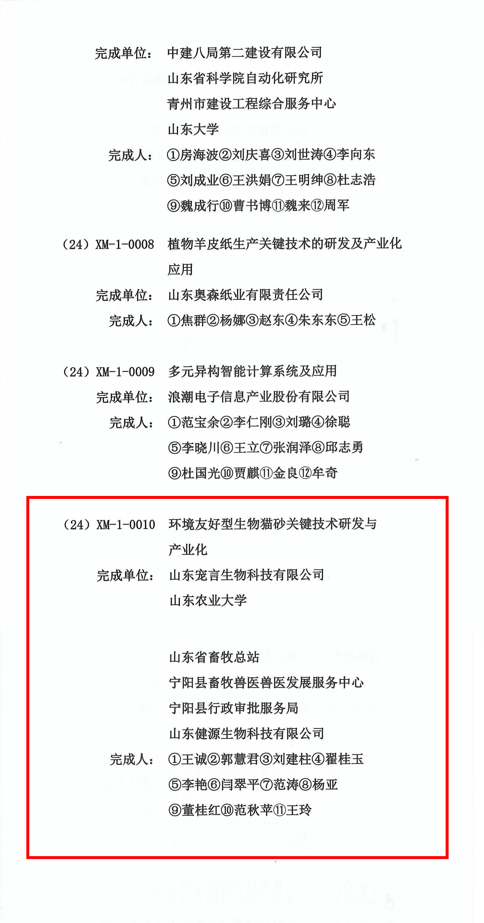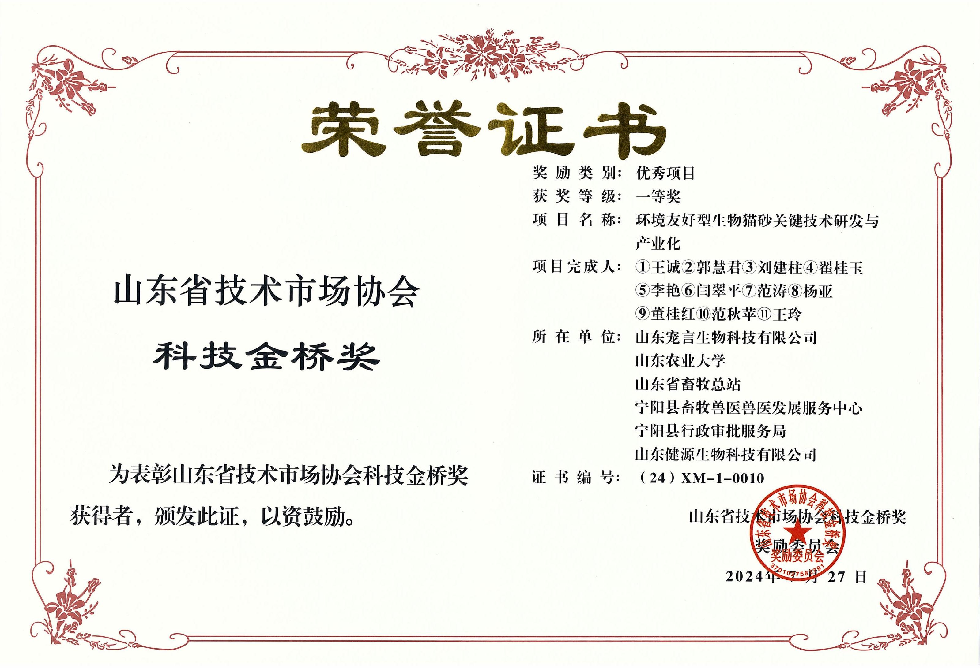 8月30日,2024年度山東省科技金橋獎(jiǎng)表彰獎(jiǎng)勵(lì)大會(huì)暨山東創(chuàng)新驅(qū)動(dòng)發(fā)展高端論壇在山東省干部學(xué)院成功舉辦。山東健源生物科技有限公司與子公司山東寵言生物科技有限公司共同完成的“環(huán)境友好型生物貓砂關(guān)鍵技術(shù)研發(fā)與產(chǎn)業(yè)化”項(xiàng)目,經(jīng)過(guò)專業(yè)組評(píng)審、評(píng)審委員會(huì)評(píng)審、獎(jiǎng)勵(lì)委員會(huì)終審,最終榮獲山東省技術(shù)市場(chǎng)協(xié)會(huì)科技金橋獎(jiǎng)優(yōu)秀項(xiàng)目一等獎(jiǎng)。