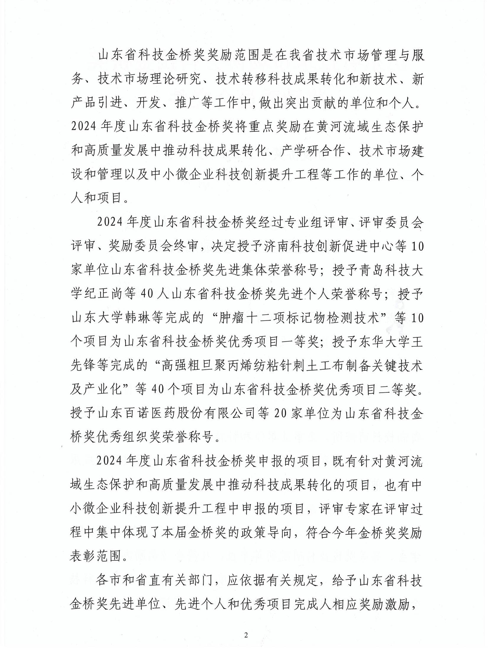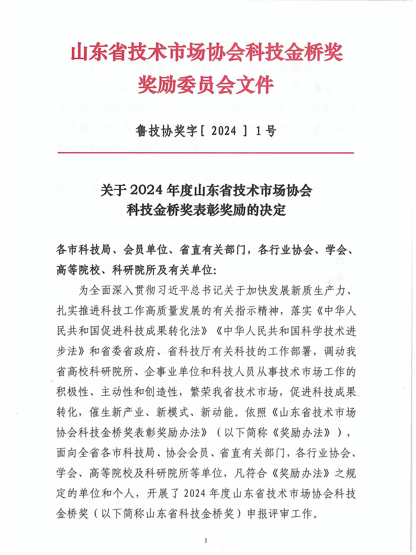 科技金橋獎(jiǎng)是山東省科技廳備案的省內(nèi)技術(shù)市場(chǎng)領(lǐng)域最高獎(jiǎng)項(xiàng),本屆金橋獎(jiǎng)重點(diǎn)獎(jiǎng)勵(lì)在黃河流域生態(tài)保護(hù)和發(fā)展新質(zhì)生產(chǎn)力中推動(dòng)科技成果轉(zhuǎn)化、產(chǎn)學(xué)研合作以及為我省科技大市場(chǎng)建設(shè)中做出突出貢獻(xiàn)等工作的單位、個(gè)人和項(xiàng)目,共評(píng)出50個(gè)優(yōu)秀項(xiàng)目,其中一等獎(jiǎng)10個(gè)。