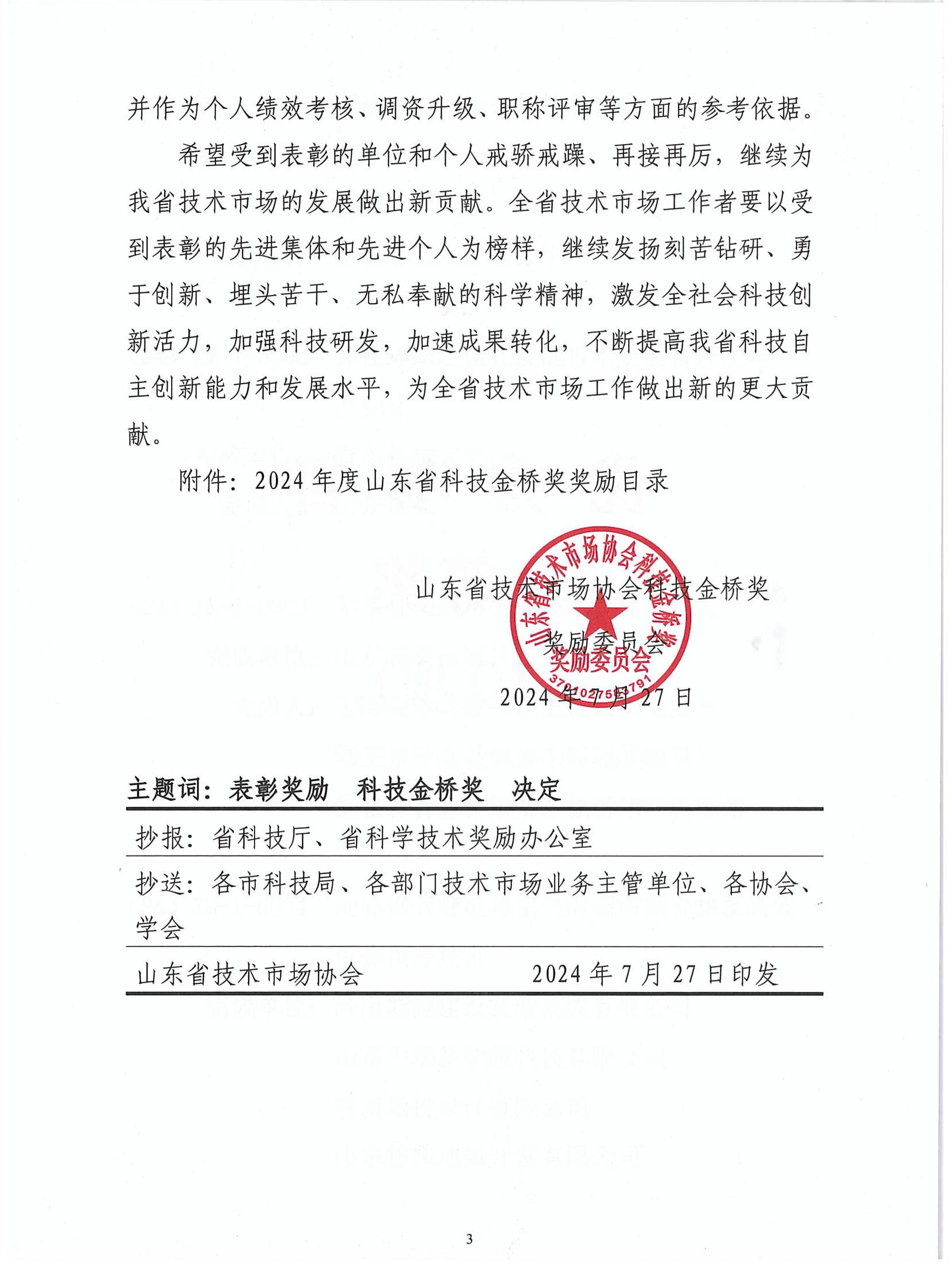大會(huì)宣讀了《關(guān)于2024年度山東省技術(shù)市場(chǎng)協(xié)會(huì)科技金橋獎(jiǎng)獎(jiǎng)勵(lì)的決定》,與會(huì)領(lǐng)導(dǎo)為2024年度山東省科技金橋獎(jiǎng)先進(jìn)集體、先進(jìn)個(gè)人、優(yōu)秀項(xiàng)目和優(yōu)秀組織進(jìn)行了表彰和頒獎(jiǎng)。