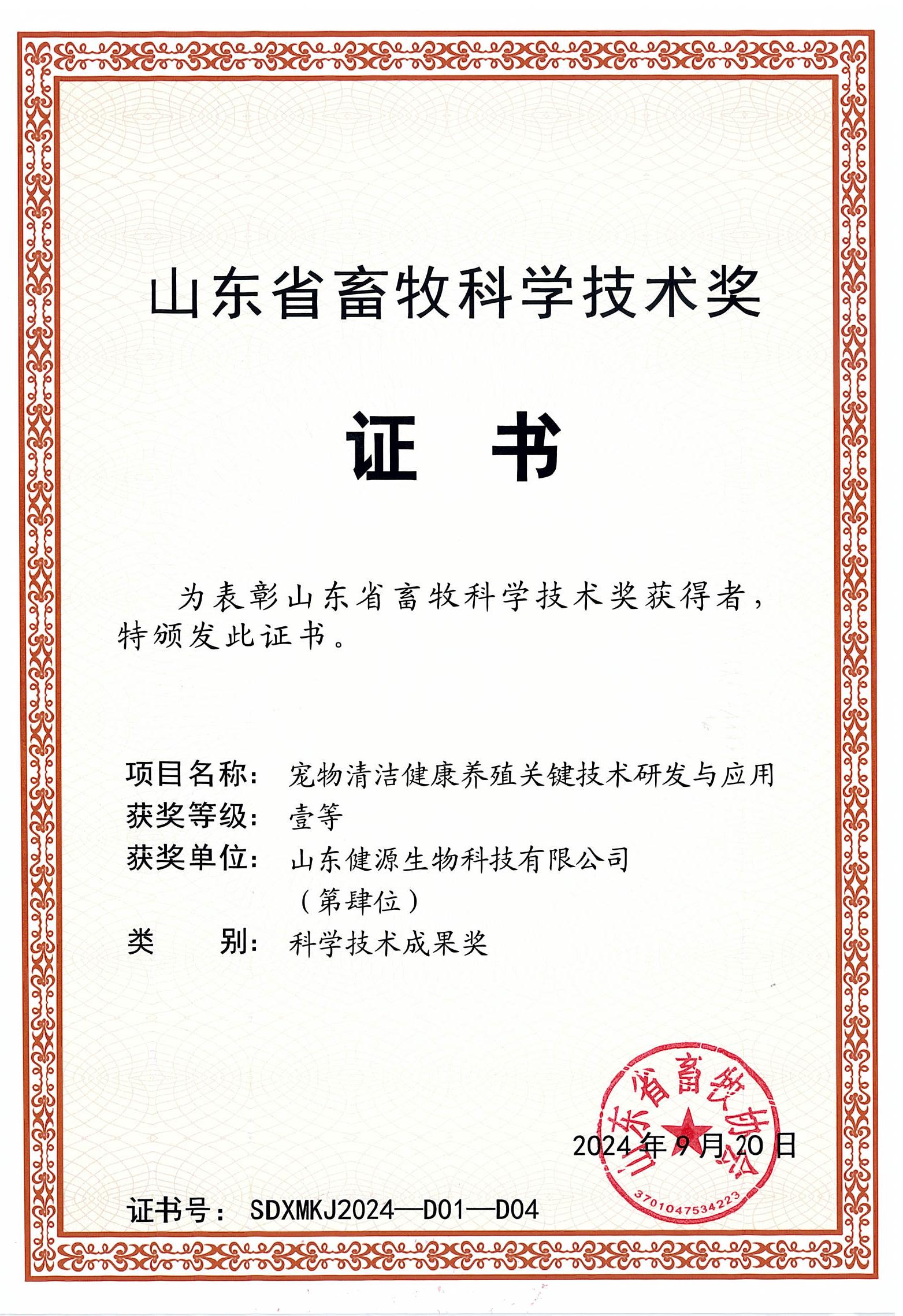 山東健源生物科技有限公司與子公司山東寵言生物科技有限公司共同完成的“寵物清潔健康養(yǎng)殖關(guān)鍵技術(shù)研發(fā)與應用”項目,憑借其創(chuàng)新性與實用性,榮獲山東省畜牧科學技術(shù)獎科學技術(shù)成果獎一等獎。
