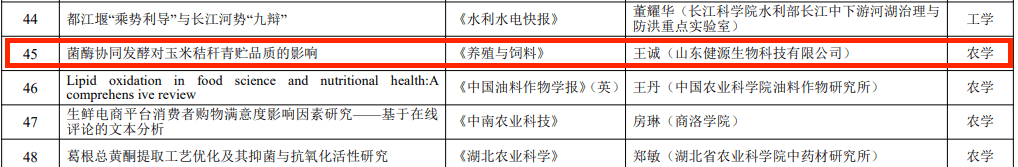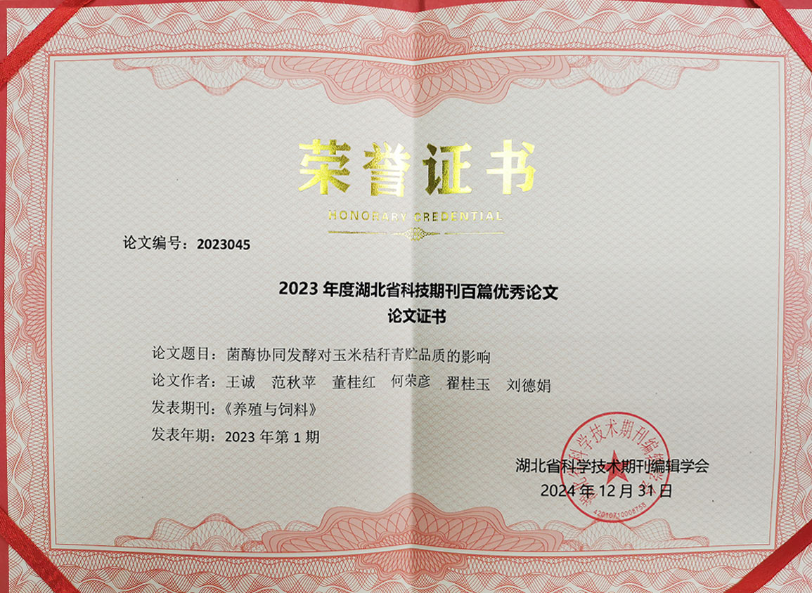 發(fā)布時(shí)間:[2025-1-15 17:6:25] 瀏覽量:2590次2024年12月31日,由湖北省科學(xué)技術(shù)協(xié)會(huì)指導(dǎo),湖北省科學(xué)技術(shù)期刊編輯學(xué)會(huì)組織實(shí)施的2023年度湖北省科技期刊百篇優(yōu)秀論文遴選結(jié)果公布,經(jīng)過(guò)評(píng)選,山東健源生物科技有限公司董事長(zhǎng)王誠(chéng)帶領(lǐng)研發(fā)團(tuán)隊(duì)撰寫的《菌酶協(xié)同發(fā)酵對(duì)玉米秸稈青貯品質(zhì)的影響》論文入選2023年度湖北省科技期刊百篇優(yōu)秀論文。