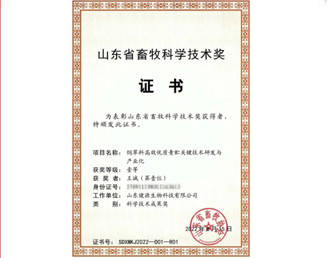 2022-8-17 【喜報(bào)】山東健源生物榮獲山東省畜牧科學(xué)技術(shù)獎(jiǎng)一等獎(jiǎng)