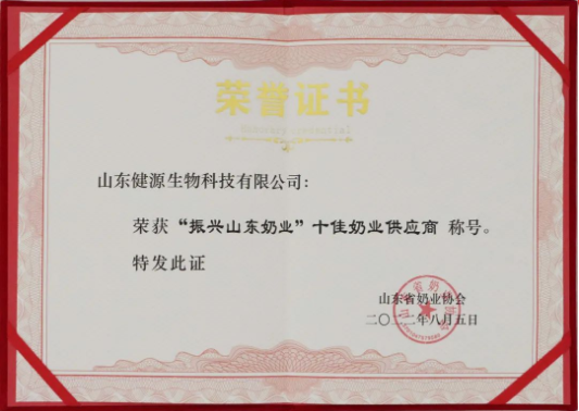 2022-8-5 祝賀山東健源生物榮獲“振興山東奶業(yè)”十佳奶業(yè)供應(yīng)商稱號(hào),外宣部主任邢燭榮獲“振興山東奶業(yè)”奶業(yè)巾幗創(chuàng)新標(biāo)兵稱號(hào)