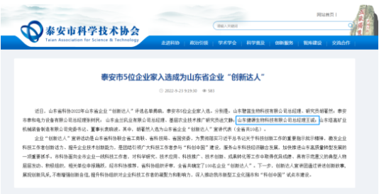 2022-10-5 山東健源生物董事長(zhǎng)王誠(chéng)榮獲2022山東省企業(yè)“創(chuàng)新達(dá)人”稱號(hào)