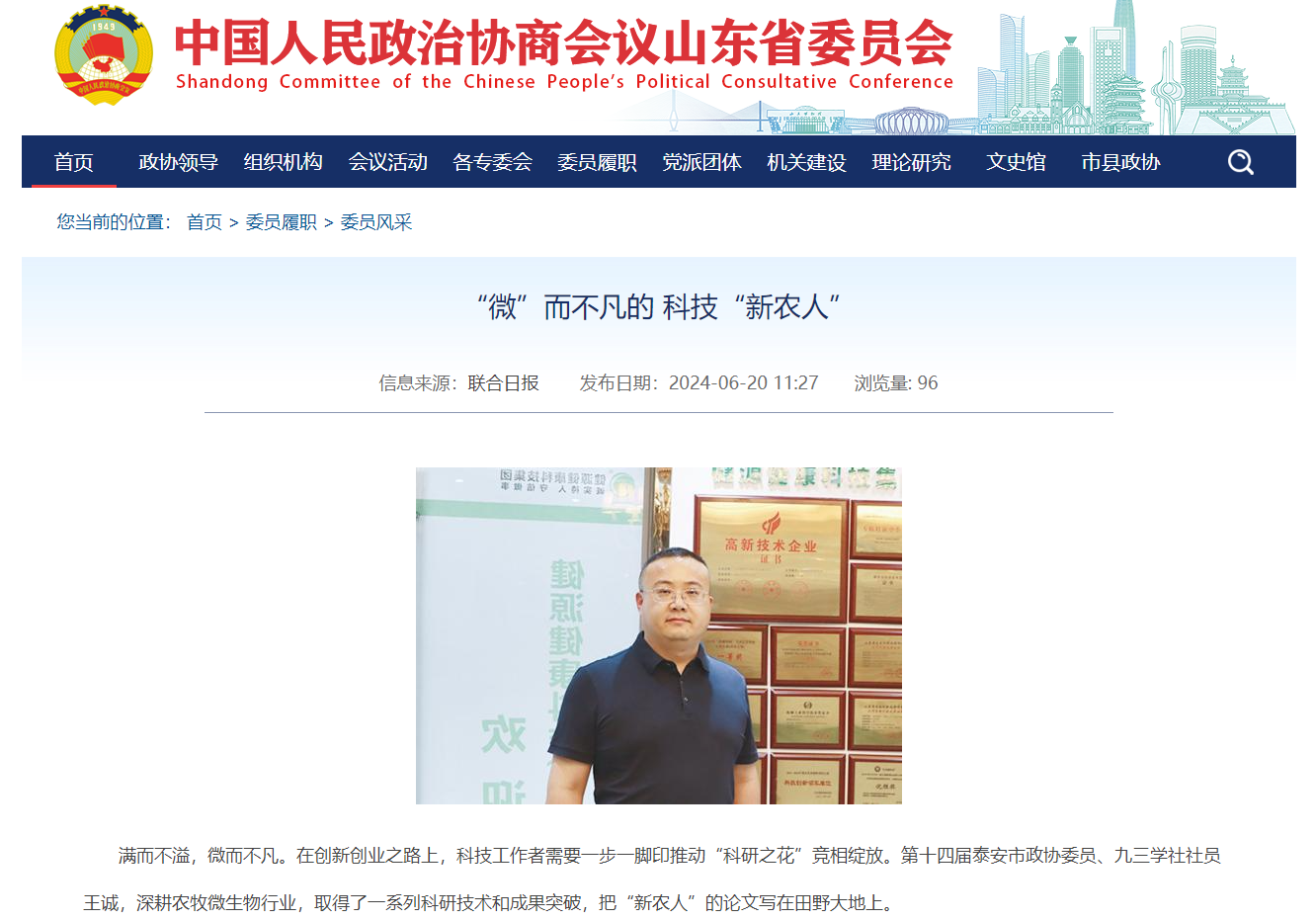 近日,中國人民政治協(xié)商會議山東省委員會官網(wǎng)推送《“微”而不凡的科技“新農(nóng)人”》文章,報道山東健源生...