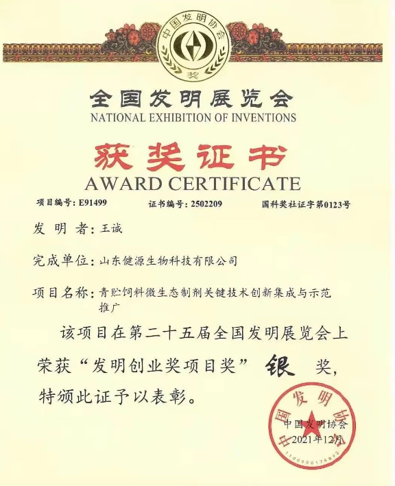 會議期間舉行全國發(fā)明展覽會“發(fā)明創(chuàng)業(yè)獎項目獎”頒獎典禮,山東健源生物科技有限公司申報的“青貯飼料微生態(tài)制劑關(guān)鍵技術(shù)創(chuàng)新集成與示范推廣”項目,受到專家評委的肯定,在眾多發(fā)明中脫穎而出,榮獲“發(fā)明創(chuàng)業(yè)獎項目獎”銀獎。
