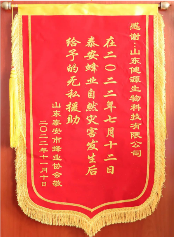 2023年4月11日,山東健源生物科技有限公司收到來(lái)自山東泰安市蜂業(yè)協(xié)會(huì)的一封感謝信和一面錦旗,感謝山東健源生物在2022年7月12日,泰安蜂業(yè)自然災(zāi)害發(fā)生后,給予的無(wú)私援助。