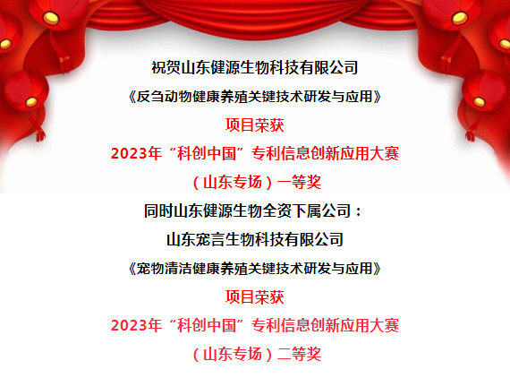 山東健源生物科技有限公司《反芻動物健康養(yǎng)殖關(guān)鍵技術(shù)研發(fā)與應(yīng)用》項目榮獲2023年“科創(chuàng)中國”專利信息創(chuàng)新應(yīng)用大賽(山東專場)一等獎,同時山東健源生物全資下屬公司:山東寵言生物科技有限公司《寵物清潔健康養(yǎng)殖關(guān)鍵技術(shù)研發(fā)與應(yīng)用》項目榮獲2023年“科創(chuàng)中國”專利信息創(chuàng)新應(yīng)用大賽(山東專場)二等獎。