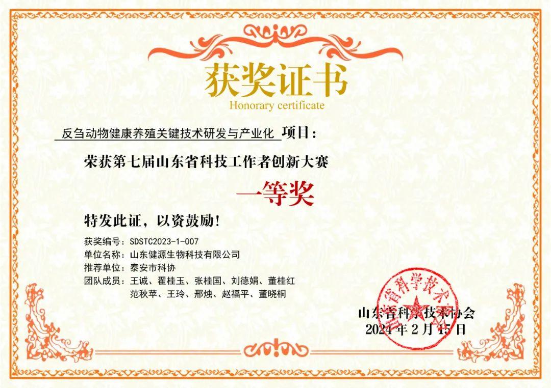 由山東健源生物科技有限公司申報(bào),泰安市科協(xié)推薦的《反芻動(dòng)物健康養(yǎng)殖關(guān)鍵技術(shù)研發(fā)與產(chǎn)業(yè)化》項(xiàng)目榮獲第七屆山東省科技工作者創(chuàng)新大賽一等獎(jiǎng)。