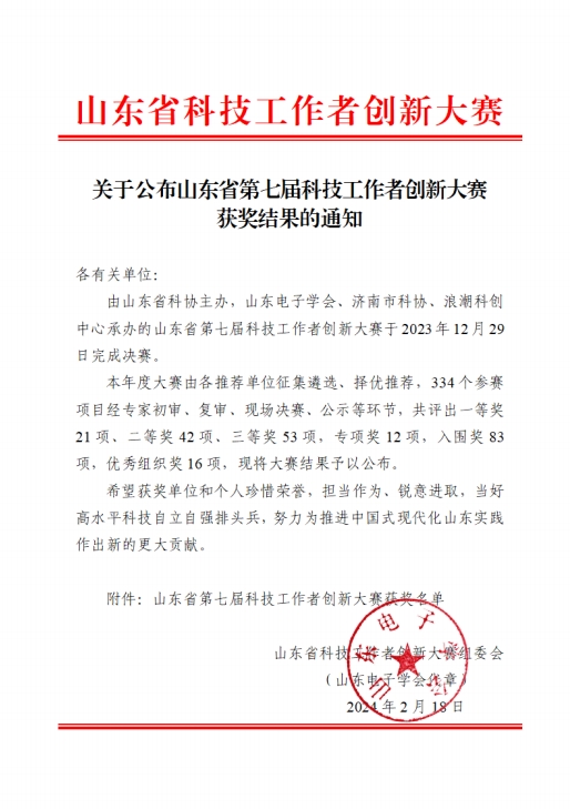 由山東省科協(xié)主辦,山東電子學(xué)會(huì)、濟(jì)南市科協(xié)、浪潮科創(chuàng)中心承辦的山東省第七屆科技工作者創(chuàng)新大賽于2023年12月29日完成決賽。本年度大賽由各市科協(xié)、省級(jí)學(xué)會(huì)、高?茀f(xié)、院士工作站等征集遴選、擇優(yōu)推薦的334項(xiàng)參賽項(xiàng)目,經(jīng)專家初審、復(fù)審、現(xiàn)場(chǎng)決賽、公示等環(huán)節(jié),共評(píng)出一等獎(jiǎng)21項(xiàng),二等獎(jiǎng)42項(xiàng),三等獎(jiǎng)53項(xiàng),專項(xiàng)獎(jiǎng)12項(xiàng),入圍獎(jiǎng)83項(xiàng),優(yōu)秀組織獎(jiǎng)16項(xiàng)。