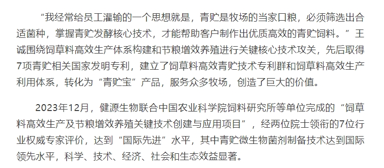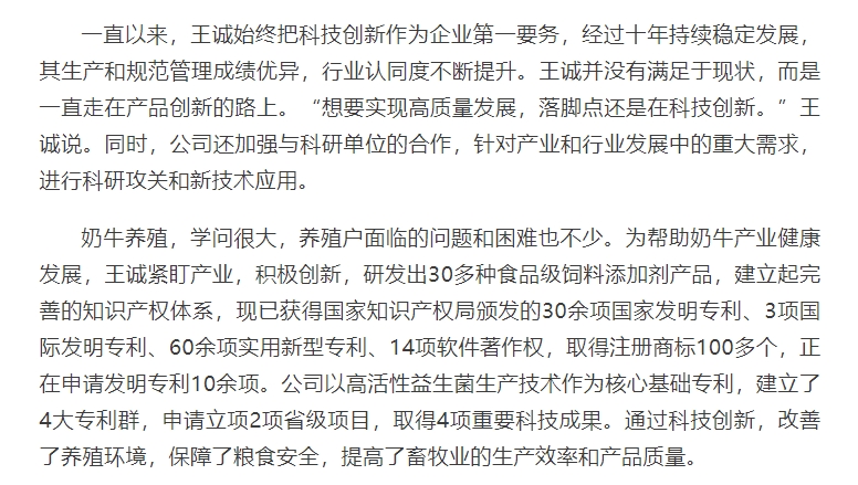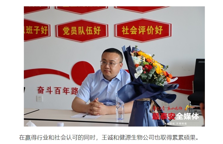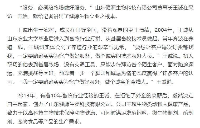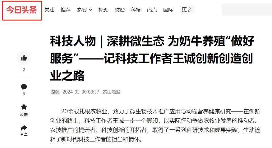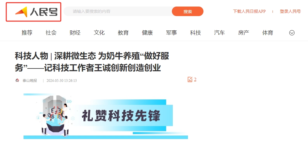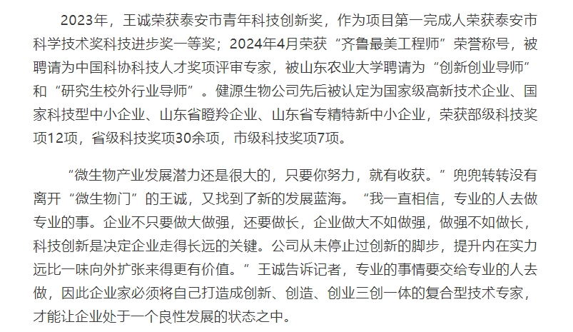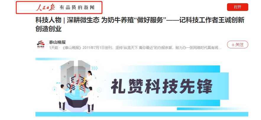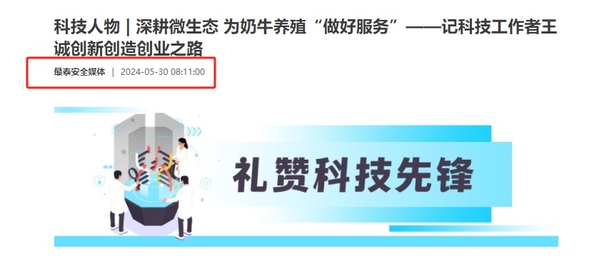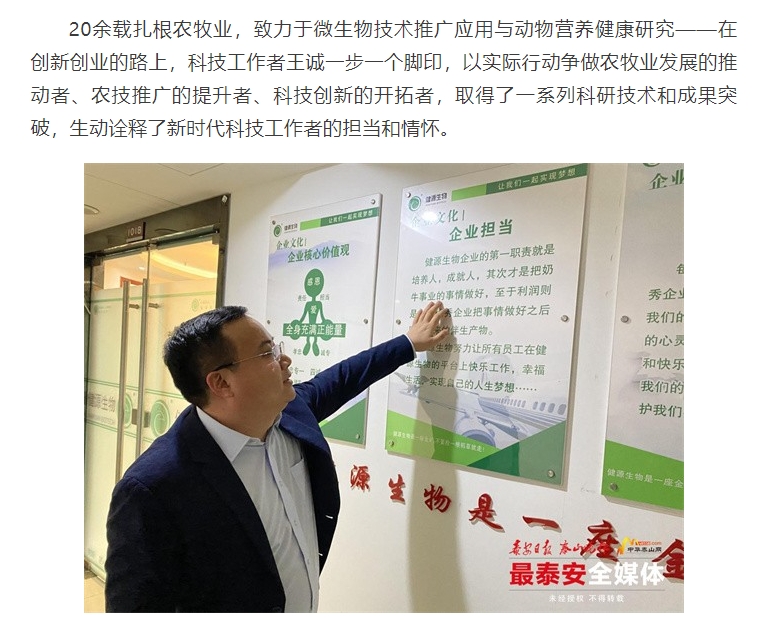 2024年5月30日迎來了第八個全國科技工作者日,山東健源生物科技有限公司董事長王誠作為泰安市科協(xié)推選的科技工作者代表接受了泰安日報記者的采訪。《深耕微生態(tài),為奶牛養(yǎng)殖“做好服務(wù)”——記科技工作者王誠創(chuàng)新創(chuàng)造創(chuàng)業(yè)之路》報道在人民日報、人民號、今日頭條、泰山晚報、最泰安全媒體等多家新聞平臺發(fā)布。